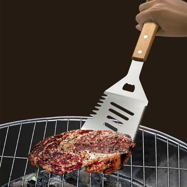 Outdoor camping barbecue tool combination wooden handle fork shovel clip BBQ accessories cloth bag stainless steel grill set